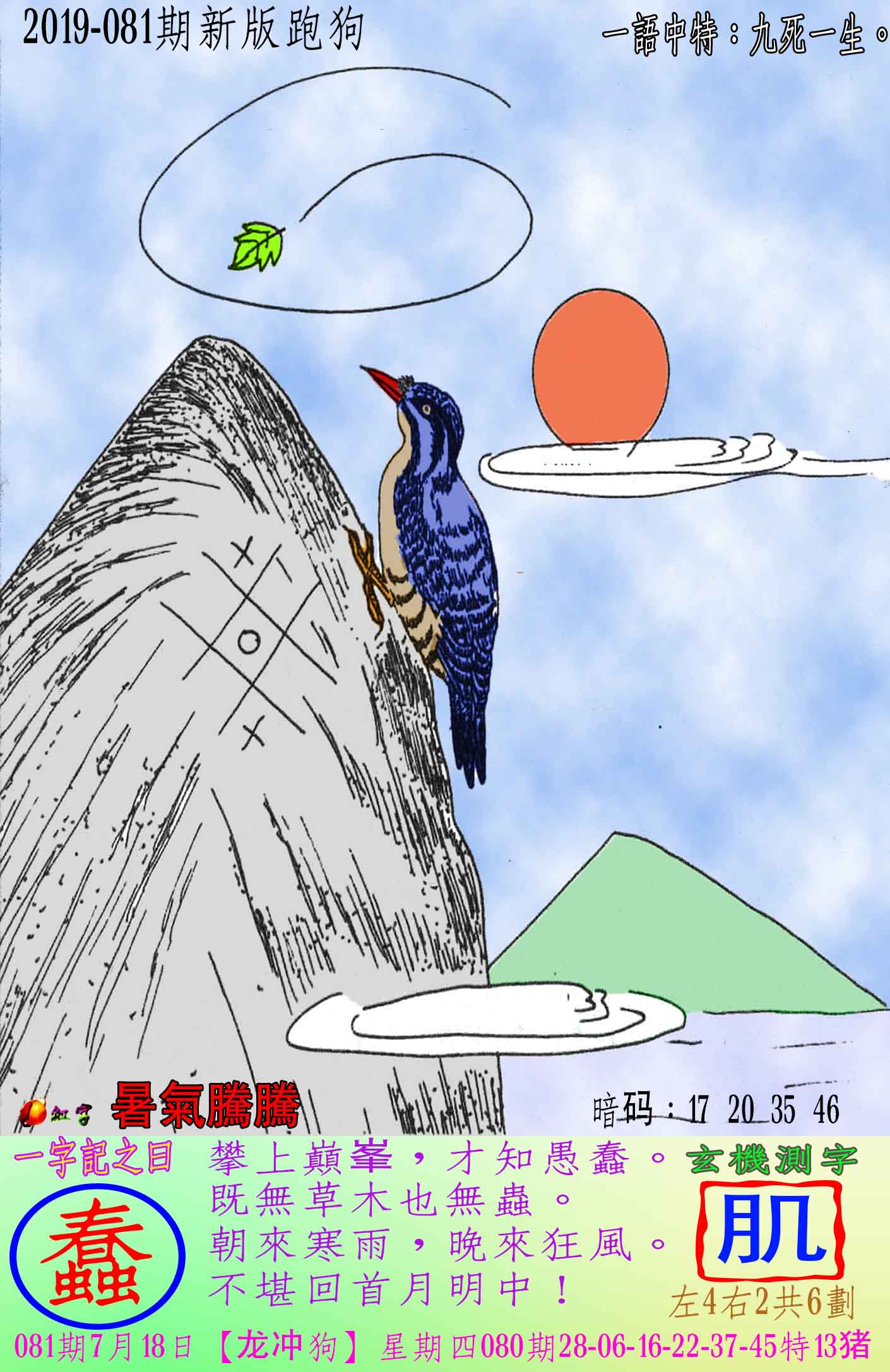 081期新版跑狗一字記之曰:【蠢】 攀上巔峯,才知愚蠢。既無草木也無蟲。 朝來寒雨,晚來狂風。不堪回首月明中! 玄機測字
