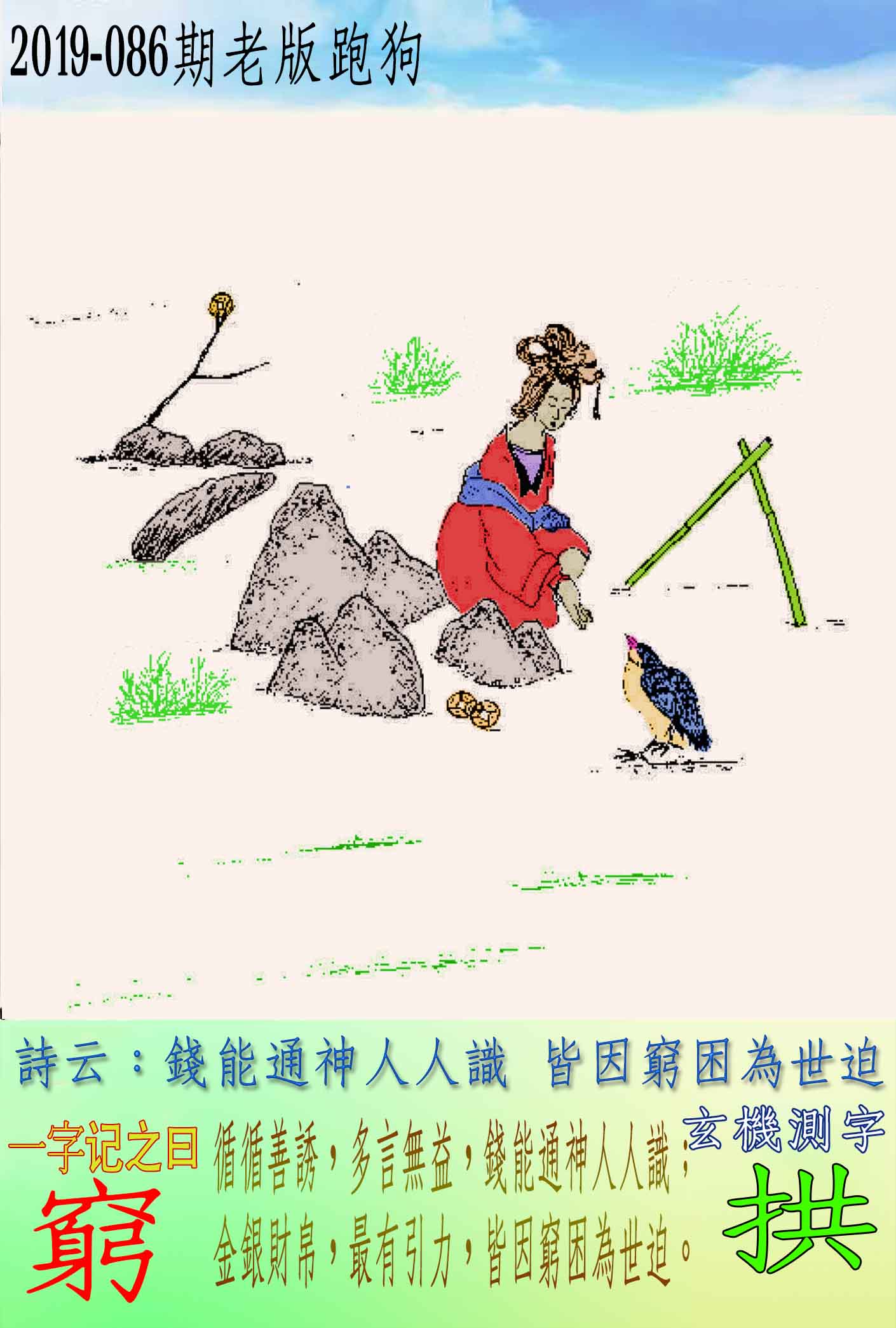 086期老版跑狗一字記之曰:【窮】 詩雲:錢能通神人人識,皆因窮困為世迫。 循循善誘,多言無益,錢能通神人人識; 金銀財