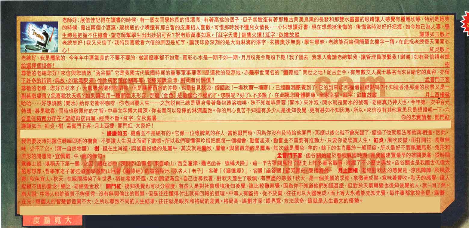【2】老總您好!我又来信了,我特别喜歡看六信的原因是紅字,讓我印象深刻的是大雨淋漓的淋字,玄機奥妙無窮,學生愚昧,老總能否給個簡單玄機字一猜。在此祝老德每天開開心心! --- 紅炎敬上