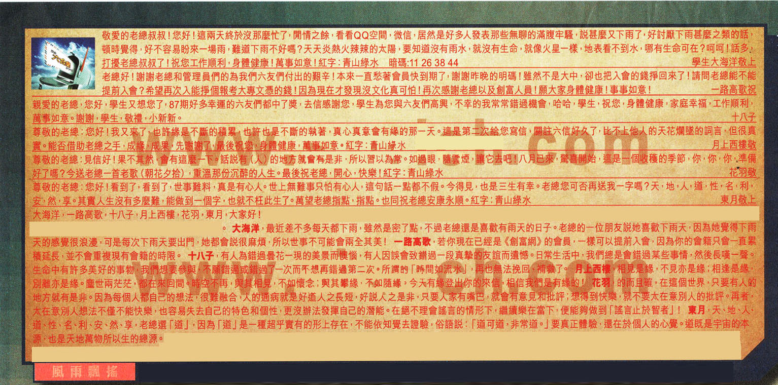 【3】親愛的老總,您好,學生又想您了,87期好多幸運的六友們都中了獎,去信感謝您,學生為您與六友們高興,不幸的我常常錯過機會,哈哈,學生,祝您,身體健康,家庭幸福,工作順利,萬事如意。謝謝,學生.敬禮。小新新。 --- 十八子